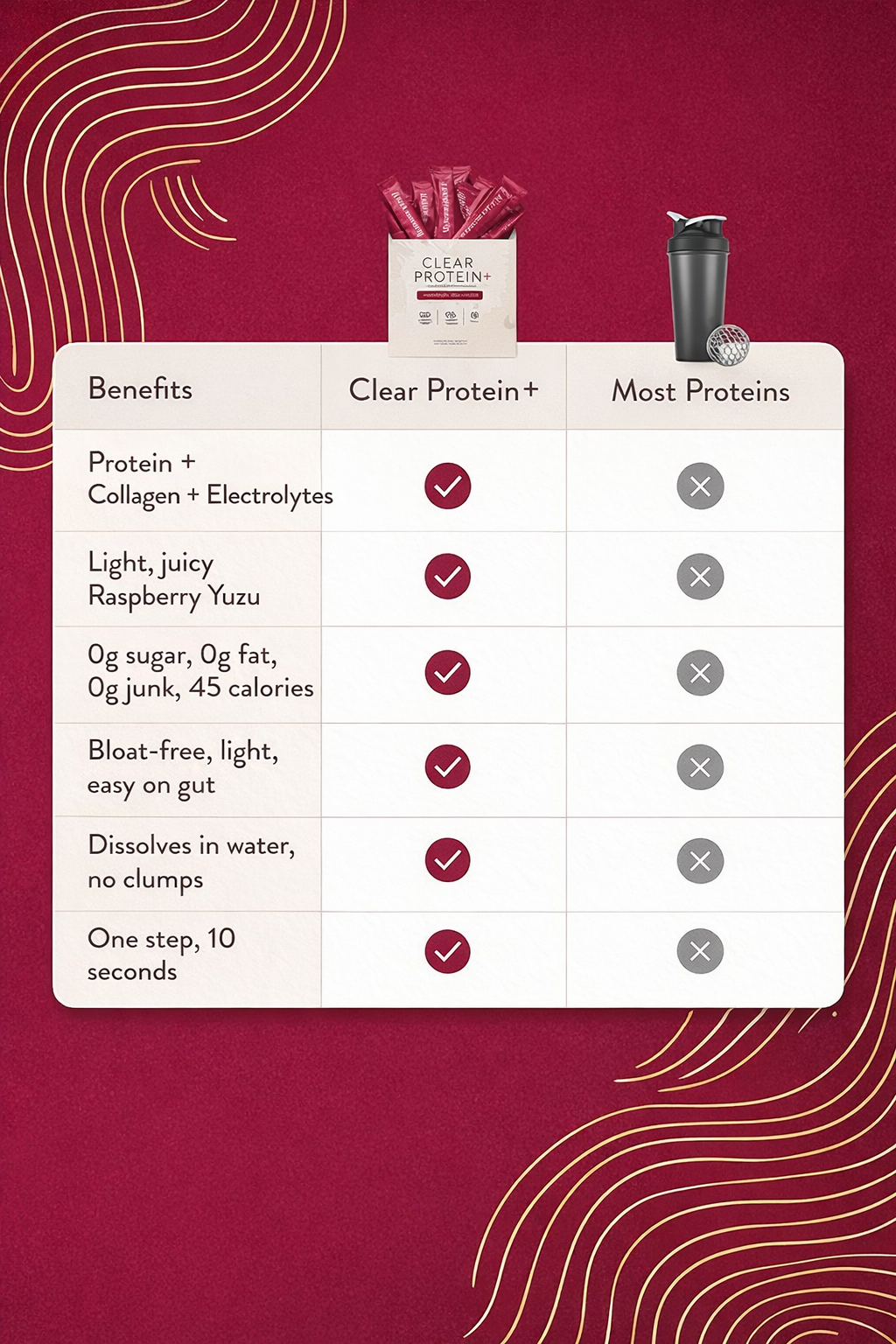 Unlike traditional protein shakes that feel heavy or cause bloating, Clear Protein+ mixes into a light, juice-like drink that is easy to enjoy anytime.